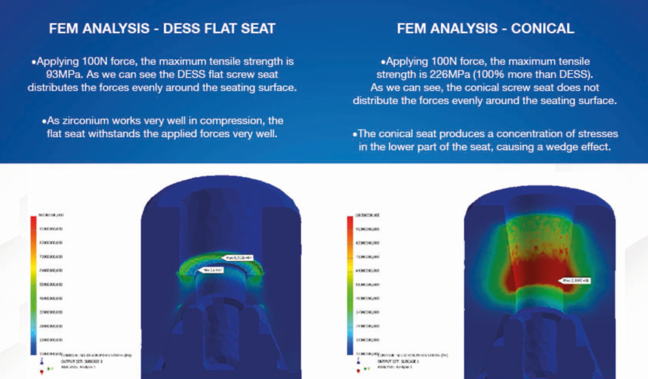 Comparative tests demonstrate that the DESS® Flat Seat Screw achieves higher preload forces, evenly distributing stress across the seating surface. This improves the durability of prosthetic restorations and minimizes damage, even with softer materials.