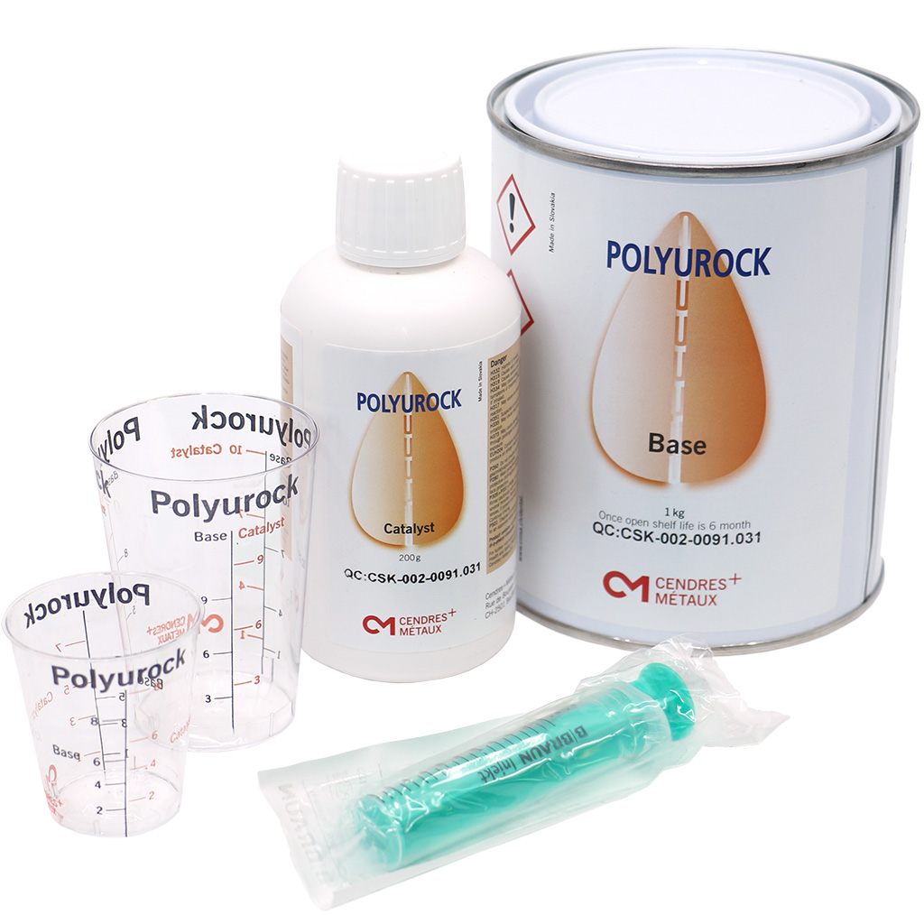Polyurock Kit | is made of: 1 x Base 1 kg 1 x Catalyst 200 ml 25 Cups 100 ml 25 Cups 50 ml 50 Spatulas